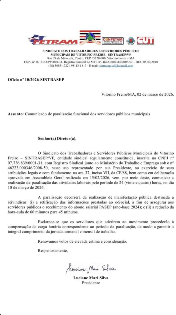 O Sindicato dos Trabalhadores e Servidores Públicos Municipais de Vitorino Freire (SINTRASEP/VF) comunicou oficialmente a realização de uma paralisação das atividades por 24 horas, marcada para o dia 10 de março de 2026.